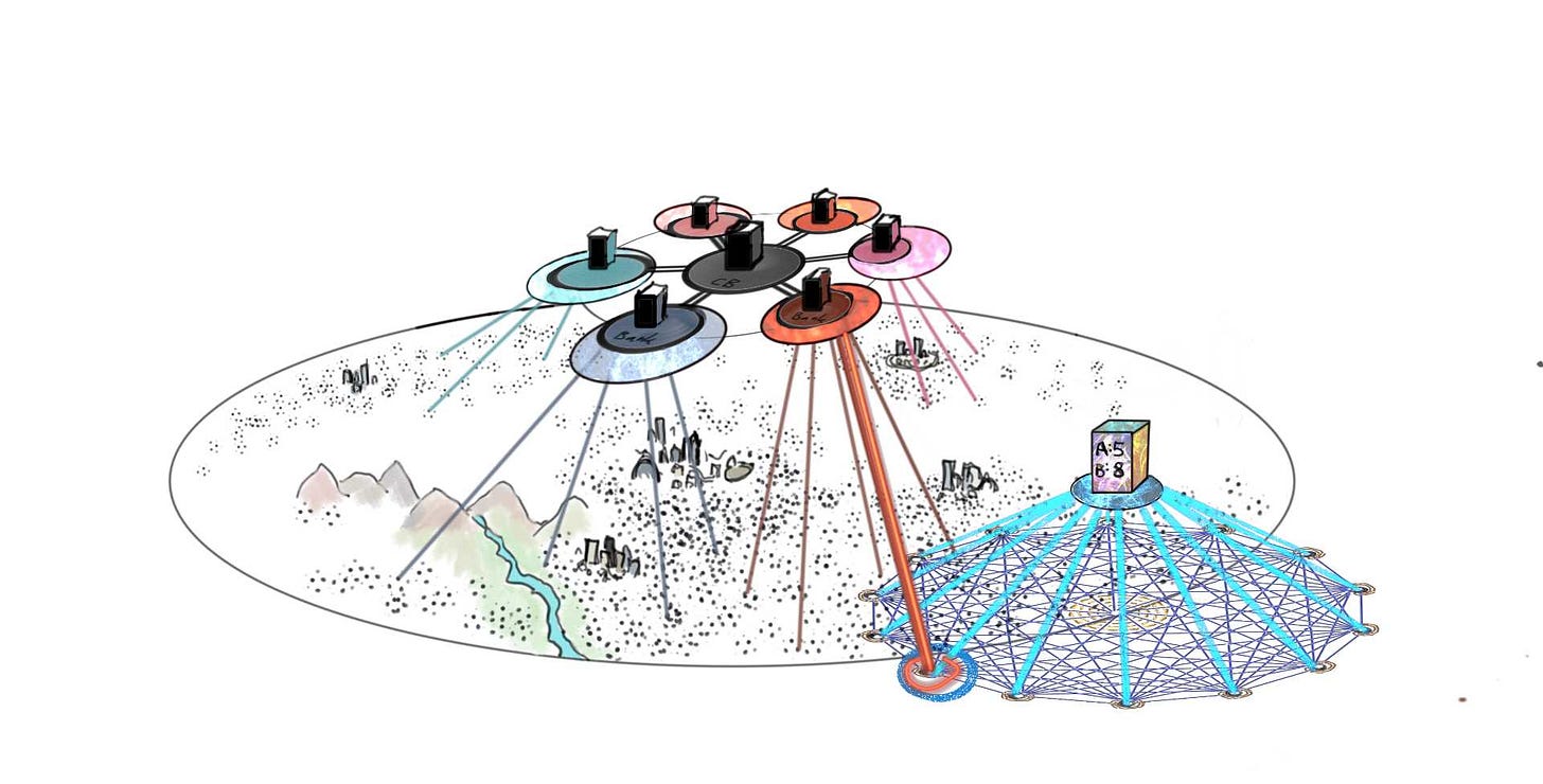 Issuing origami stablecoins is a great craft project for the whole family, but most ‘serious’ stablecoin issuers - like Tether, Paxos and Circle Internet Financial - frown upon this practice as silly. They don’t use origami as the basis for their stablecoin moneyvouchers, and they also have a very different motivation for issuing them. Rather than hurling a paper pigeon at someone who hands them Layer 2 bank-money, they will issue digital moneyvouchers to that person on a decentralised crypto network. The person will see these Layer 3 chips pop up in their crypto wallet, after which they can transfer them to someone else’s crypto wallet. Here’s a (kinda crude) visual representation of that, using some older drawings I did a couple years ago, based on my Hovering Banks series.