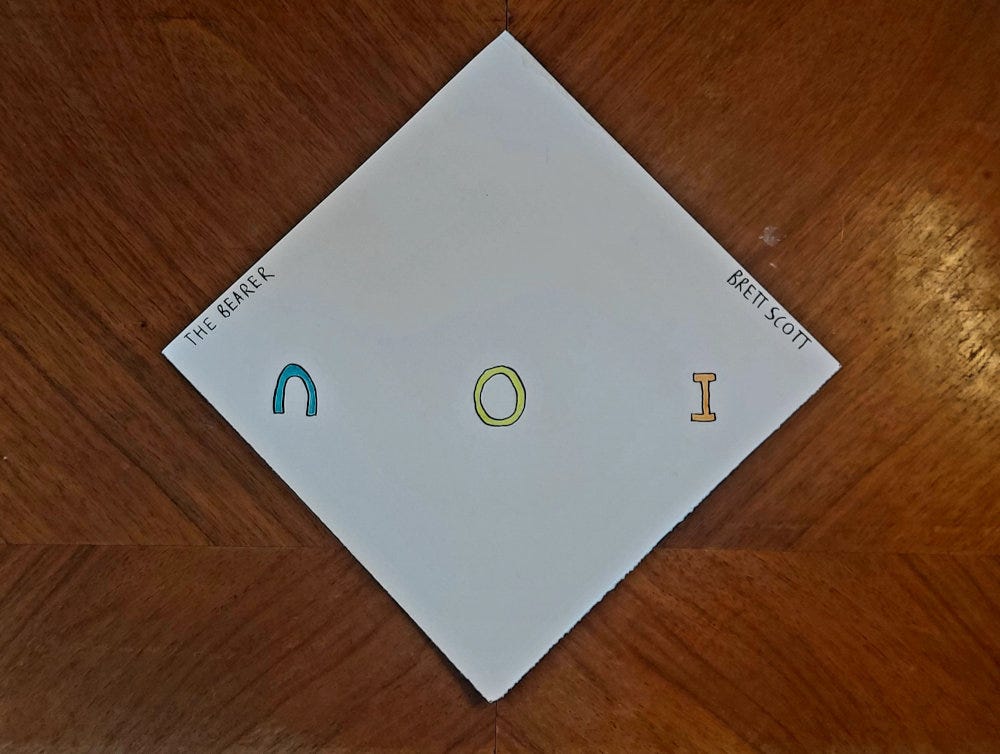 Who is the I though, and who is the U? In my case the I is me, Brett Scott. I’m the one issuing the promise. The U is going to be left open-ended. It will be whoever ends up holding the stablecoin, so let’s just call them ‘the Bearer’. Flip the paper around as shown and write these as follows.