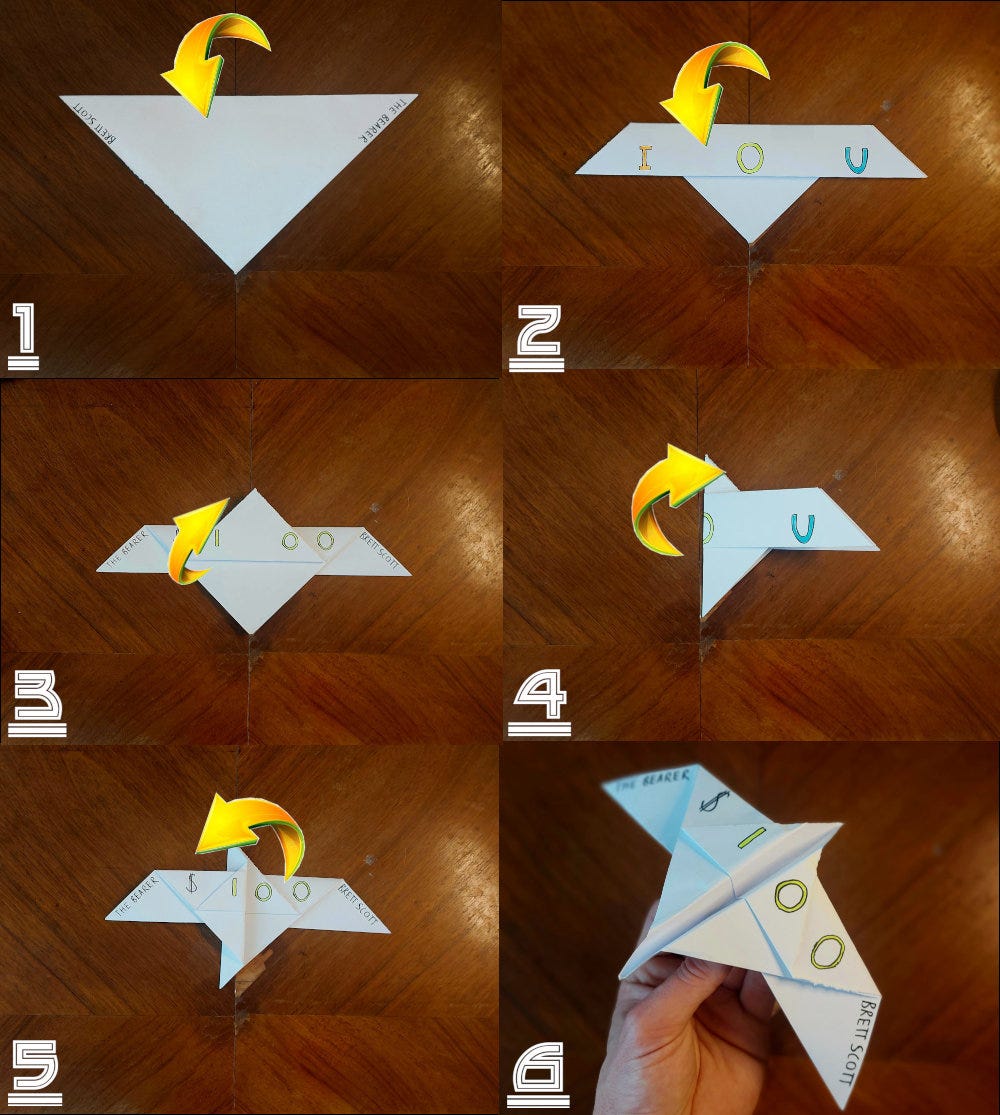 We now have all the components of the IOU contract laid out, but to bring it all together we need to make the folds displayed below. You start by folding the paper top to bottom in half (1), and then fold it from the top again half way down until you reveal the IOU (2). You then flip it over onto its other side and fold the top half of the triangle upwards to reveal the amount (3). You then fold it in half left to right (4), and make a wing by folding it part of the way back right to left (5). Do the same on the other side to complete a second wing (6).