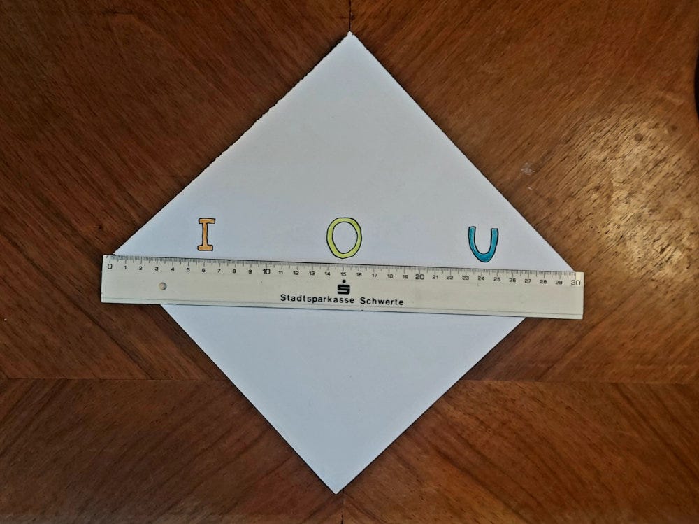 IOU is short for ‘I Owe You’. We write this on the paper because a basic stablecoin is a voucher or promissory note (in common language, a promise).