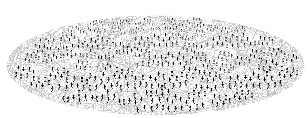 Traditional economics has a serious conceptual problem when it comes to money. 18th and 19th century economists basically looked at the image above - in which we have a large-scale network of strangers who are all entangled together - and then used it as an explanation for why money must exist.