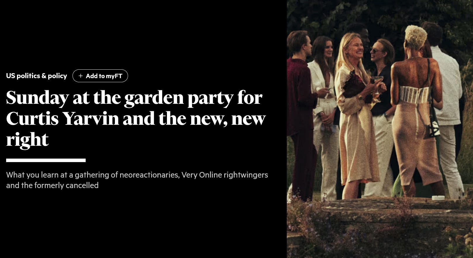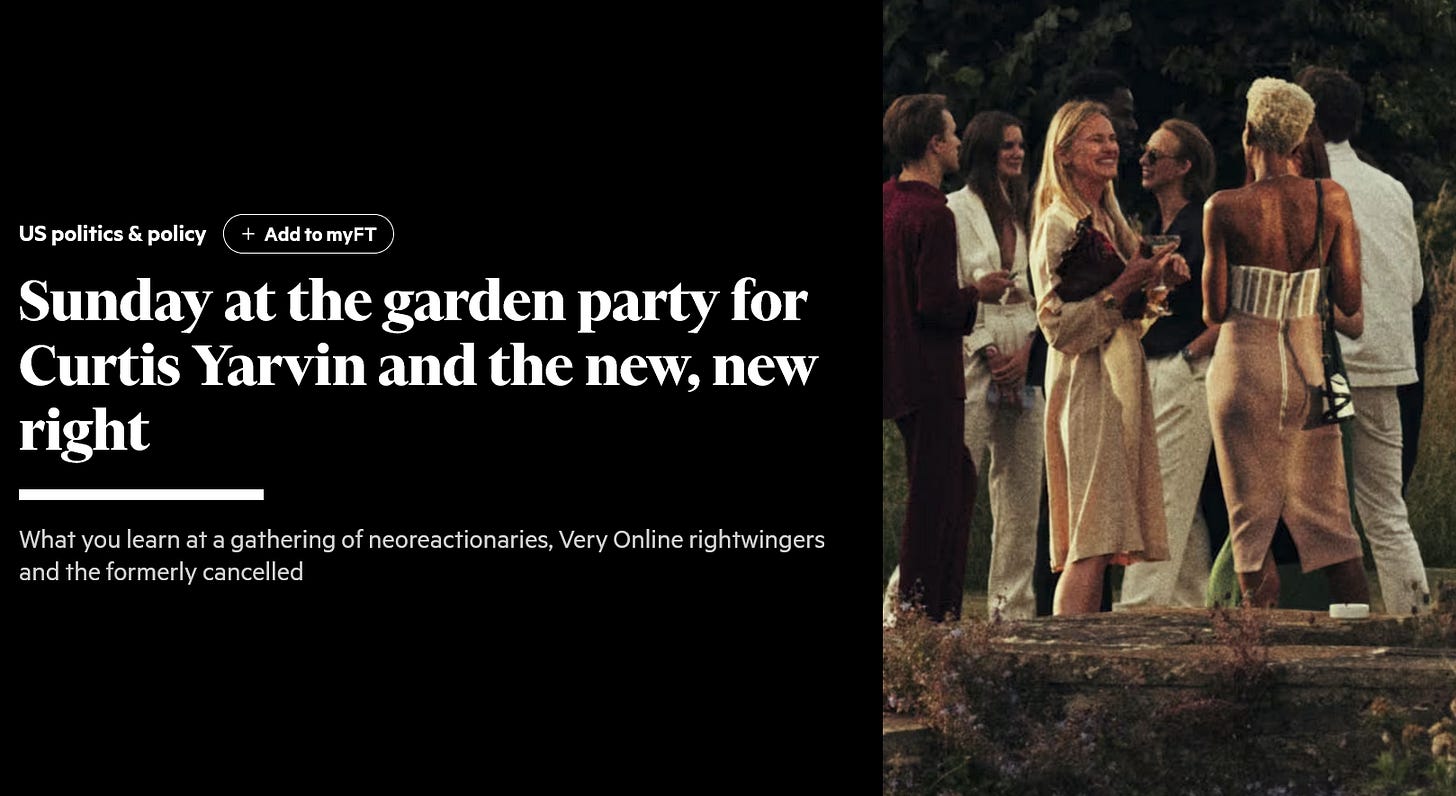Another journalist who captures this very same sense of strangely vulnerable elite insider-ness is Jemima Kelly of the Financial Times, when - in August 2025 - she hung out with the far-right edgelord king, Curtis Yarvin, at an elite invite-only party in London.