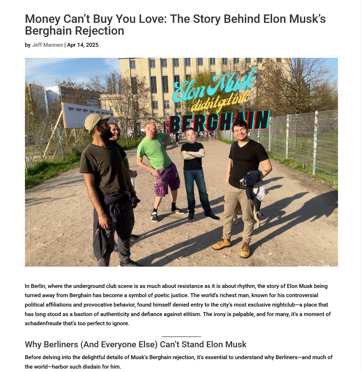 Elon claims that he refused to enter, due to a peace sign being painted on the wall, but the true story for Berliners is that he got bounced by Sven Marquardt, the infamous doorman of the club, a person over whom Elon has no power.