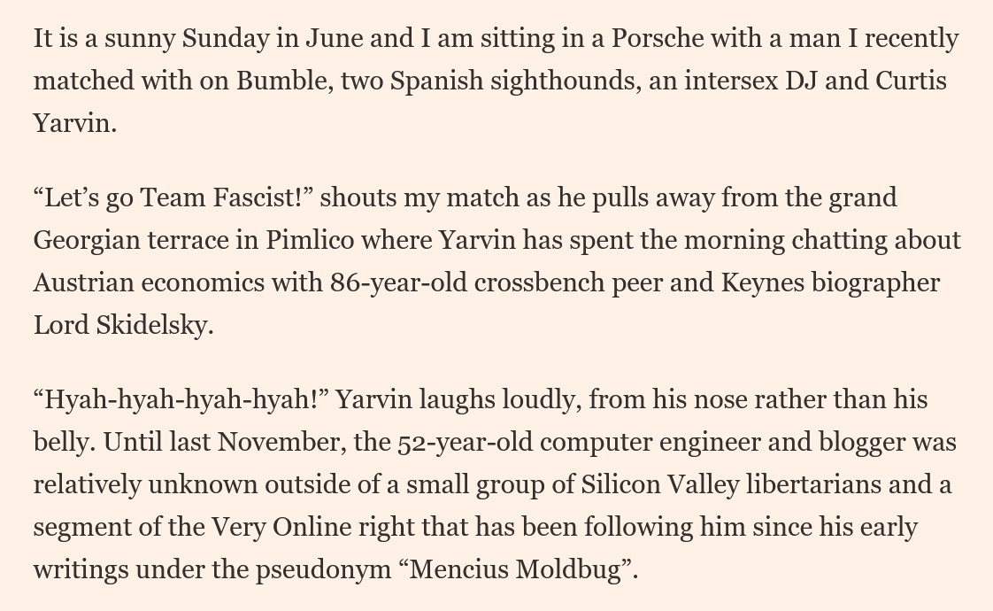 To many on the political left, Yarvin is seen as a kind of bogeyman, a high lord of neo-fascism, but in social life he’s a ‘liberal elite’ like any other, taking the taxi, turning up at the cocktail parties, and sending cheeky messages to his journalist friends and anyone else who feels like community. He, like Jemima, is in that position of shaping public opinion, and he undoubtedly prefers to hang out with her in the green room than to sit down for a meal with the distant people whose opinion he shapes (ya know, the Christian moralists or white supremacists).
